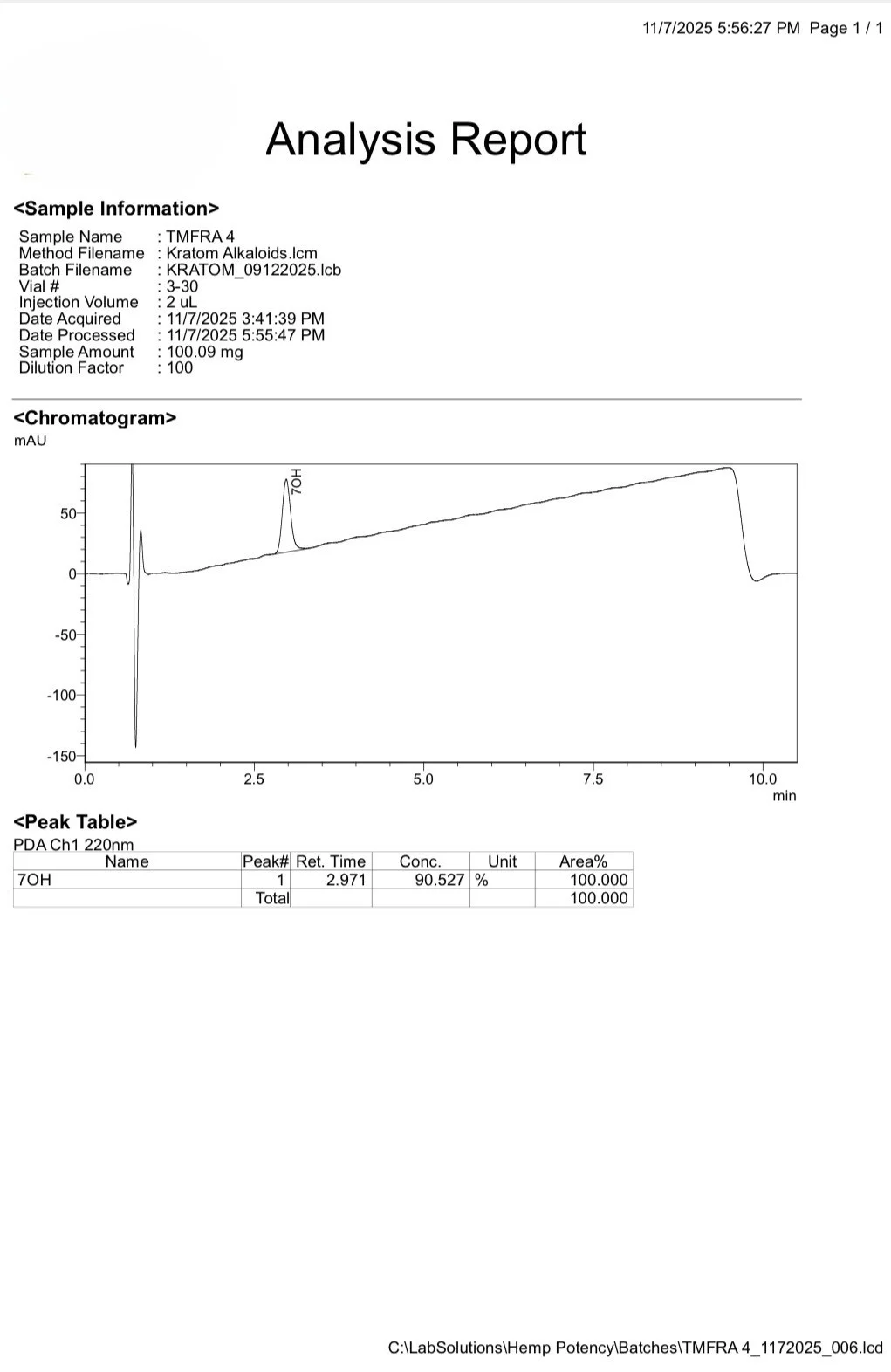 It is also part of our new procedure to obtain additional third party labs on every new powder. That means every 7-OH powder we offer will have 3-4 sets of expert analysis before being offered to the public. Once by the chemists that make the extract, once at their chosen third party(s), and once more at a third party lab of our choice. We hope this will help educate and set a new industry standard as well as inspire confidence in our customers that they are making the best choice.
